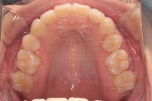 上顎の叢生改善のスペース獲得のために上顎の第一小臼歯を抜歯、下顎に関しては凸凹は軽度ですが第二大臼歯整直のためのスペースを全て後方に求めるのは無理なので、前方にスペースを確保する目的で両側の第二小臼歯を抜歯しました。また、矯正治療前に下顎両側第三大臼歯も抜歯しました。